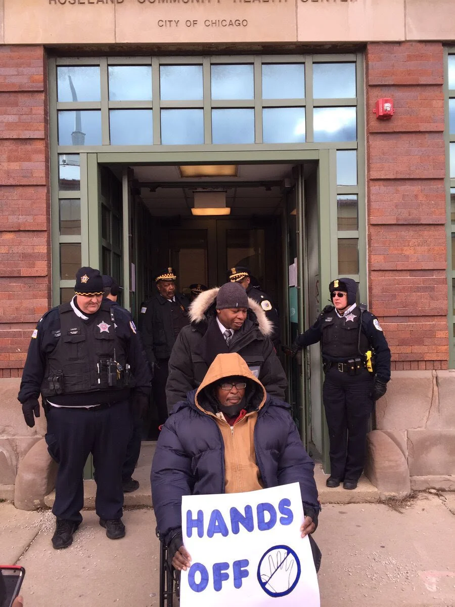On December 8th, we escalated our actions by occupying the clinic to protest its closure. Ronald 'Kowboy' Jackson, a leader of the Mental Health Movement and STOP, chained himself to the doors of the clinic. Outside, members and allies chanted and spoke to the press. Obari Cartman — a psychologist, professor, and ally — explained, "There's business in privatizing, business in locking up, and corporatizing the wellness of our people." In the end the police cut Kowboy's chains and removed him from the clinic. Though Rahm cut our chains, he cannot cut our resolve. We will fight until our clinics are re-opened and fully funded. Pictures of the action are here, and the Chicago Reporter’s article about this is here.